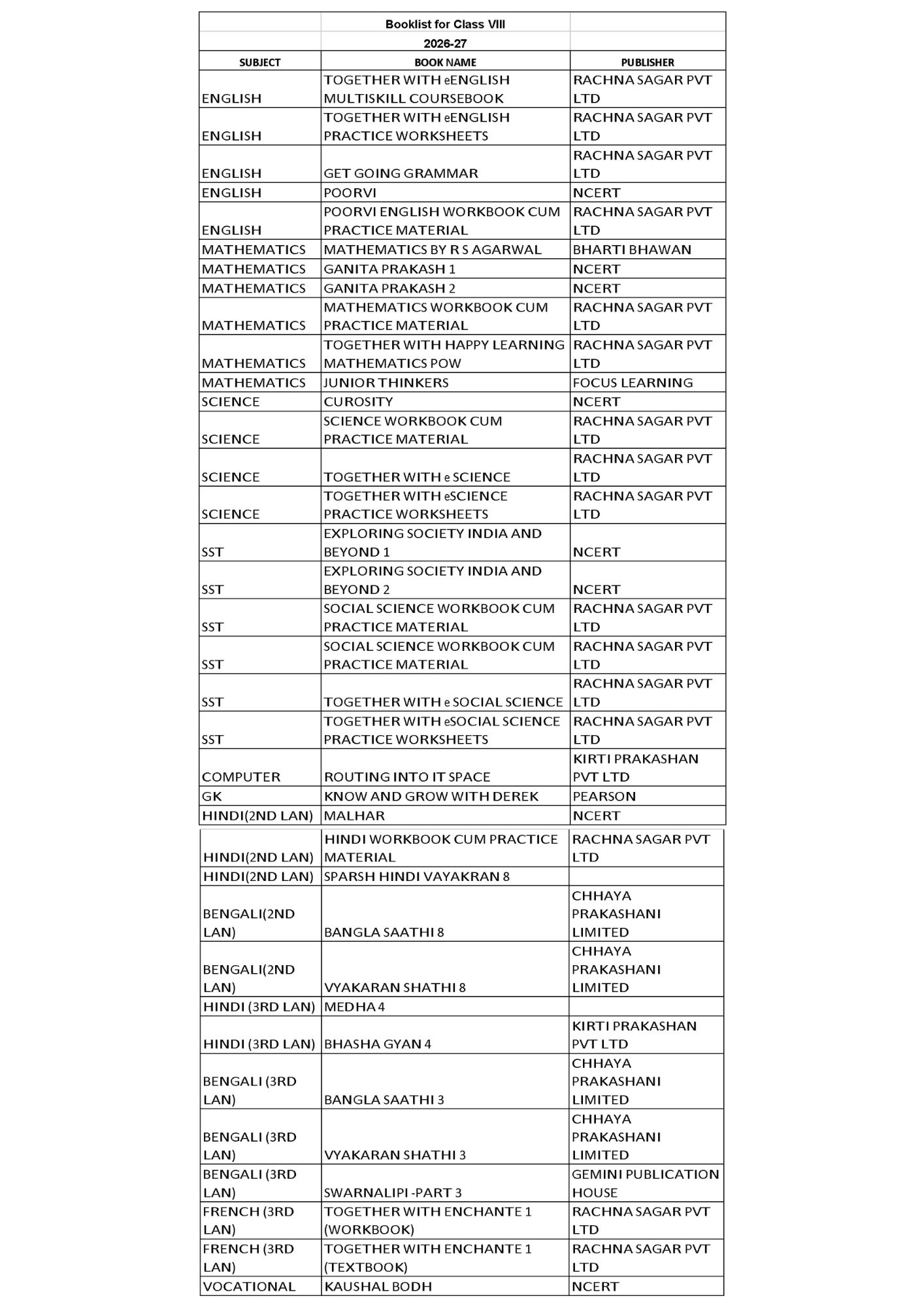 Booklist for Class VIII